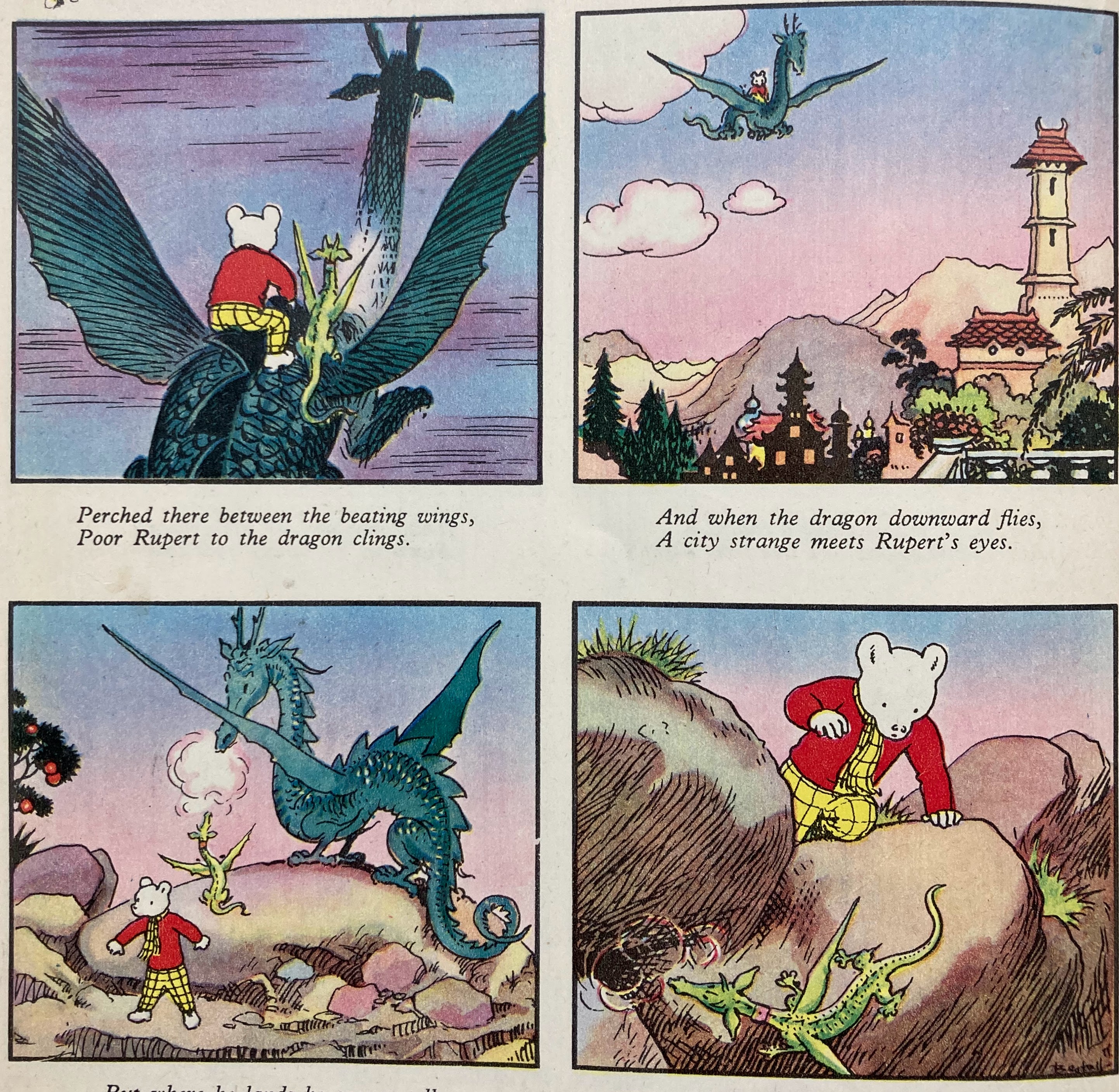 They travel to places familiar and not: the seaside for holidays, Santa’s mountaintop home, offshore islands, but most of the time they explore the environs of their pastoral neighborhood. They celebrate Christmas, they encounter dragons and imps, are dutiful offspring of caring parents (Rupert always; the others most of the time), helpful and good-hearted.