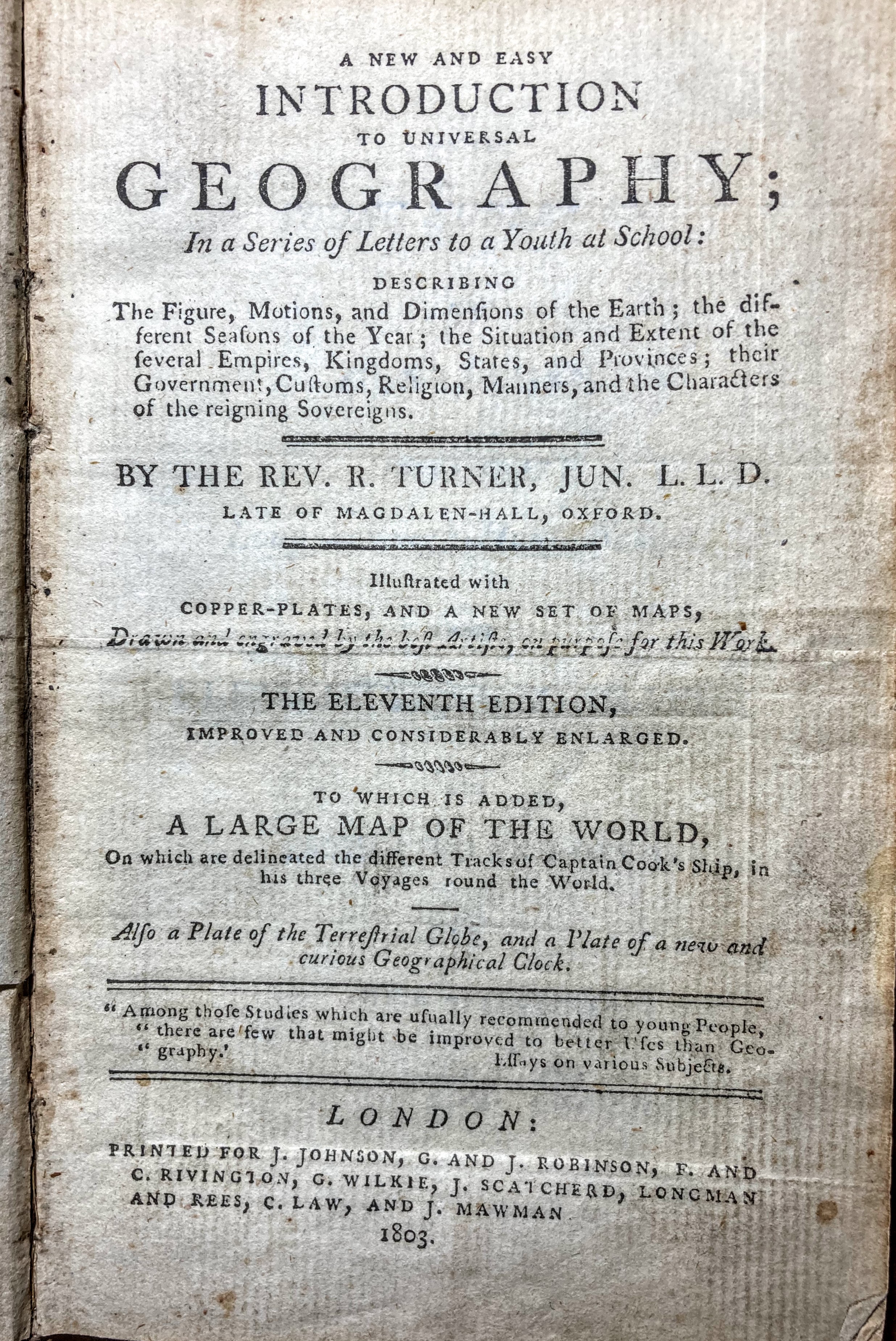 The second is an 11th edition of A New And Easy Introduction To Universal Geography; In A Series of Letters to a Youth at School by the Rev R. Turner (London, Collins, 1803).