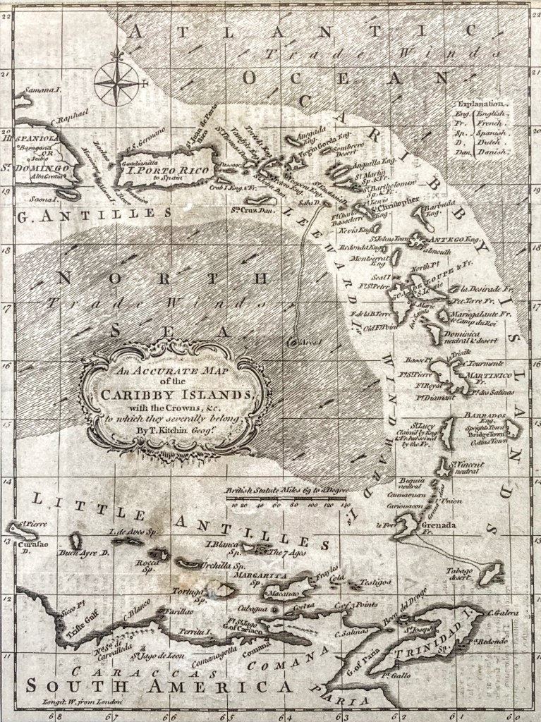 In 1980, I purchased an 18th century map of the Caribbean (“An Accurate Map of the Caribby Islands, with the Crowns, etc., to which they severally belong” by T. Kitchin, Geogr.), which I purchased when about to head off on a posting to Barbados.