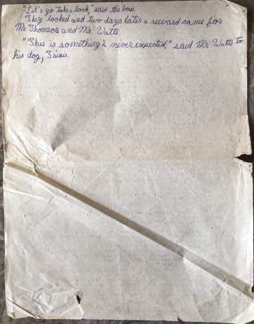 After over half a century in storage, the whole thing is rather the worse for the wear (the second page used for scribbling and math work). For some inexplicable reason, it’s finished off with a few hand-written lines that proceed onto a fourth page.