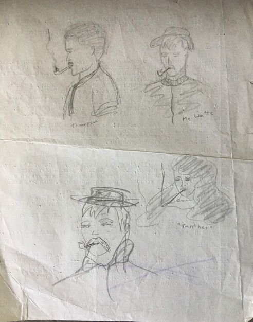 My mother, being an avid (amateur) water-colorist and oil painter, also sketched two of the characters on the back of one page (see below).