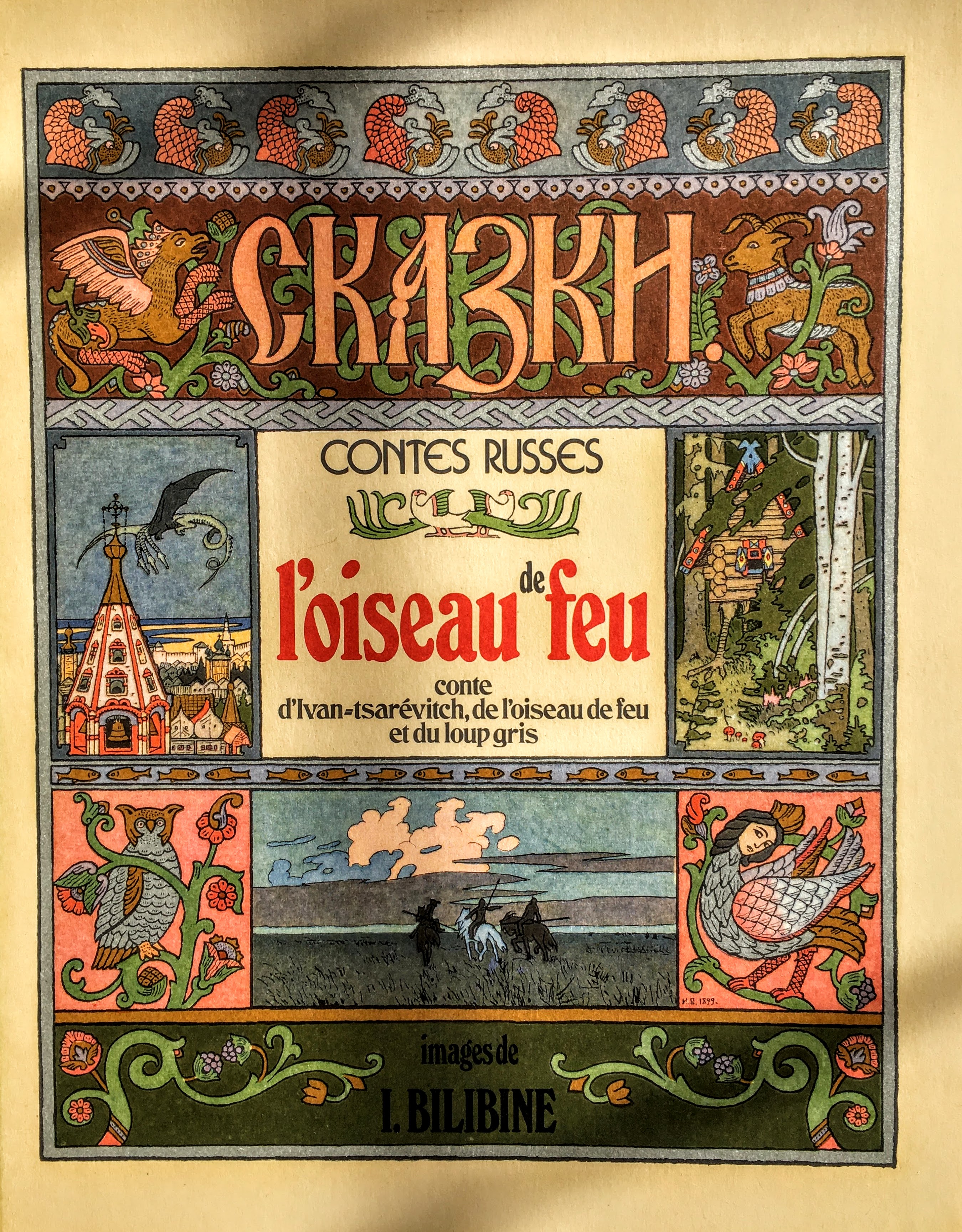 I came across Bilibine’s drawings in Paris in the early 1980s. I was in the French capital on business (lucky me!) and grabbed the opportunity to check out a couple of art galleries near to my hotel. For 54 French francs (the books’ plastic cover still has the price tag), I bought a reproduction of Billibine’s illustrated Russian Fairy Tales. Naturally, it’s a French translation (by Luda) entitled Contes Russes (Editions la Farandole, 1976).