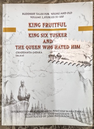 While most of the patients kept their heads down studying their cellphones, I became attracted to a rather unusual book half-hidden amidst the pile of journals. It was the following: King Fruitful/King Six Tusker and The Queen Who Hated Him, Buddhist Tales for Young and Old, Volume 2, Stories 51-100. (Published by the Buddhist Literature Society, Inc, New York, 1996, but printed and distributed for free by The Corporate Body of the Buddha Educational Foundation, Taipei, Taiwan).