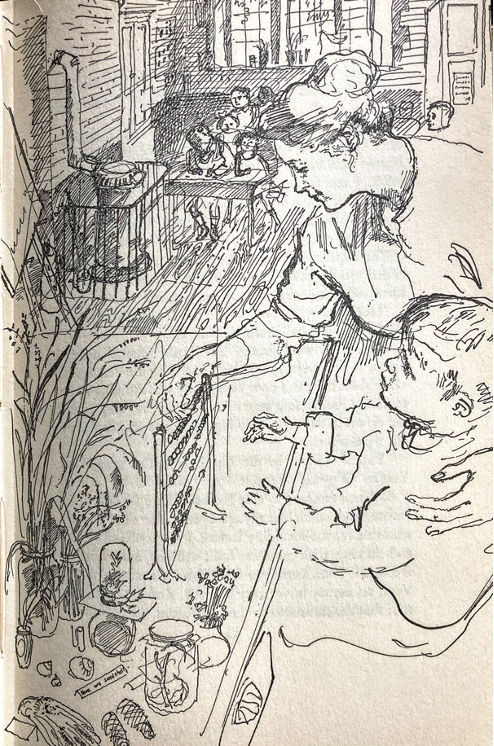 Here are two illustrations of the kitchen in my 1959 Hogarth Press edition, which really capture that description: