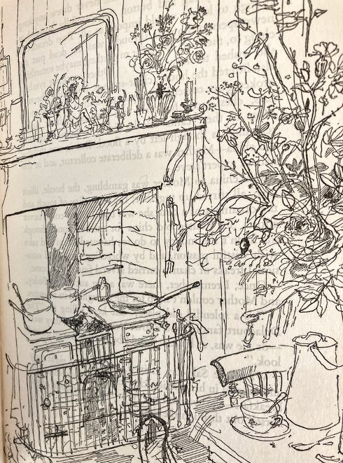 ‘That kitchen, worn by our boots and lives, was scruffy, warm and low, whose fuss of furniture seemed never the same but was shuffled around each day. A black grate crackled with coal and beech-twigs; towels toasted on the guard; the mantel was littered with fine old china, horse brasses and freak potatoes. On the floor were strips of muddy matting, the windows were choked with plants, the walls supported stopped clocks and calendars, and smoky fungus ran over the ceiling. There were also six tables of different sizes, some armchairs gapingly stuffed, boxes, stools and unravelling baskets, books and papers on every chair, a sofa for the cats, a harmonium for coats, and a piano for dust and photographs. These were the shapes of our kitchen landscape, the rocks of our submarine life, each object worn smooth by constant nuzzling, or encrusted by lively barnacles, relics of birthdays and dead relations, wrecks of furniture long since foundered, all silted deep by mother’s newspapers which the years piled round on the floor.’”