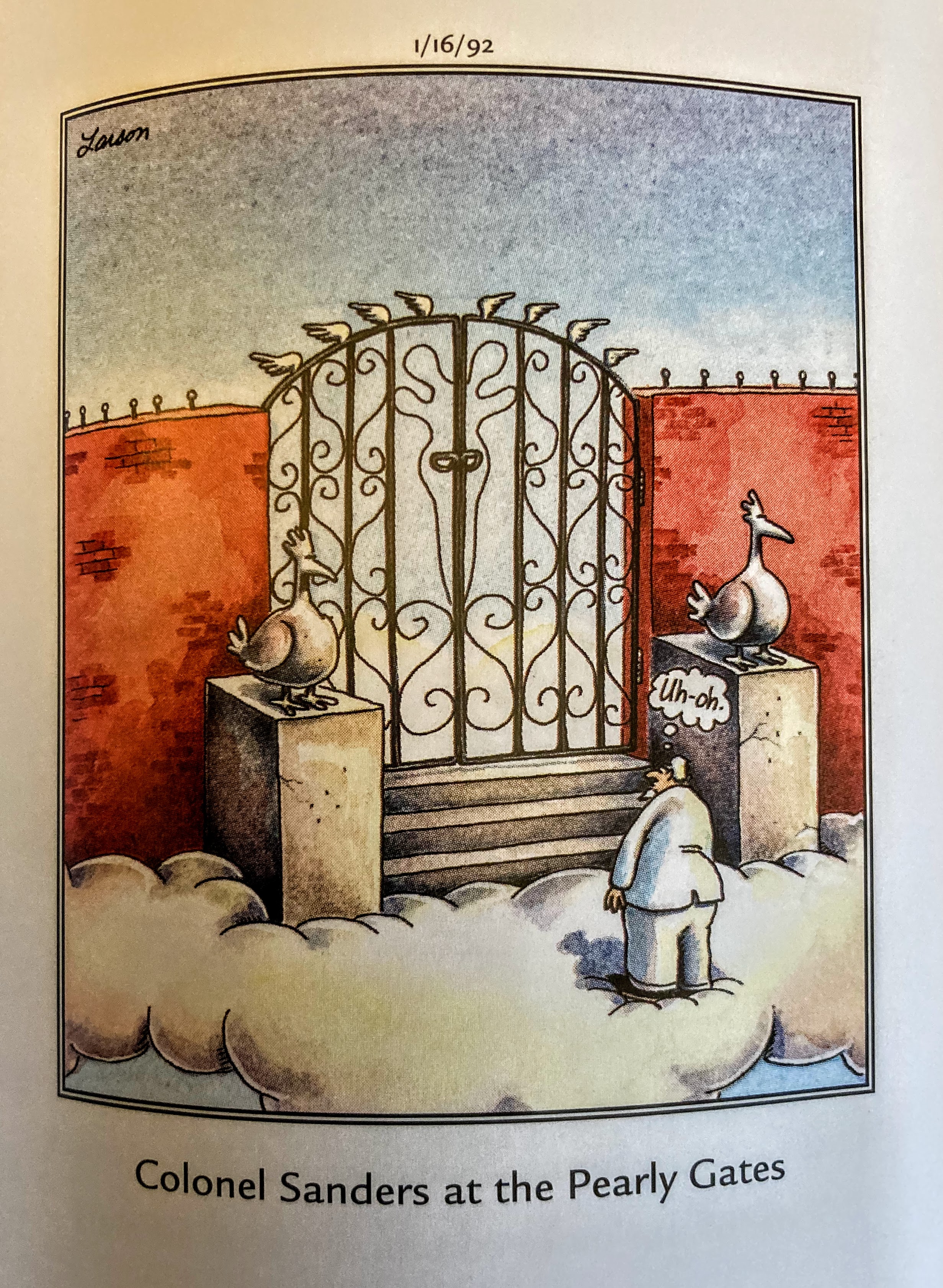 The other day I was discussing cartoons with my ten-year old grandson. To my surprise, he told me his favorite cartoons are from The Far Side series, especially the one where Col. Sanders reaches Heaven, only to discover that God is not what/who he expected:
