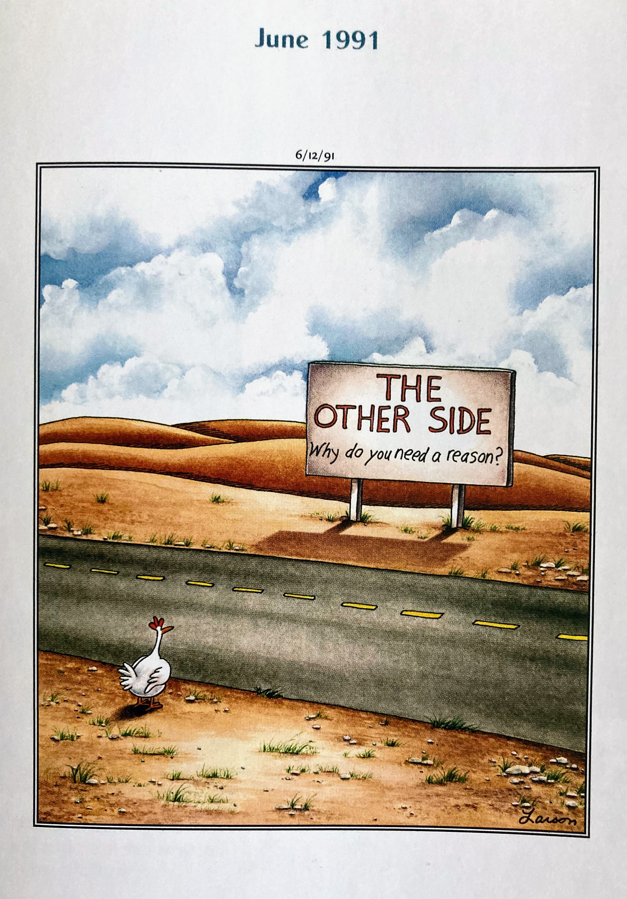 I’ve written before about my love of comic strips. That affection also applies to cartoons (the distinction between the two being one panel instead of a strip). On Facebook I participate in a Far Side sharing group. It’s a great testament to the cartoon’s enduring popularity.