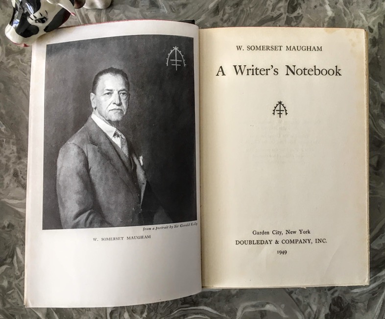 This summation leads Maugham to the purpose of A Writer’s Notebook. He had been told (by whom he could not recall) that every author should keep a notebook, and he was scrupulous in following that advice. His notes amounted to fifteen “stoutish” volumes, beginning in 1892 and ending in 1944, which he then reduced to one book “no longer than many a novel” (p. xv) — 367 pages, to be exact. Here is a photograph of my copy (still in perfect condition), picked up – if memory serves me well – at a rummage sale.