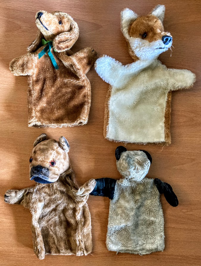 Besides the book-reading, our parents (I think they took turns) entertained us every night with puppet shows, using the tent pole as a base for storytelling. We owned several hand puppets, some of animal, some of human characters. The animals were our favorites. Mine included a bear (you can see how well used he is), a red fox and two dogs, all suitably named; my sister had two cats and my brother a tiger (maybe more, but those details escape me). We played with them constantly, making up stories and adventures. Naturally, I still have mine.