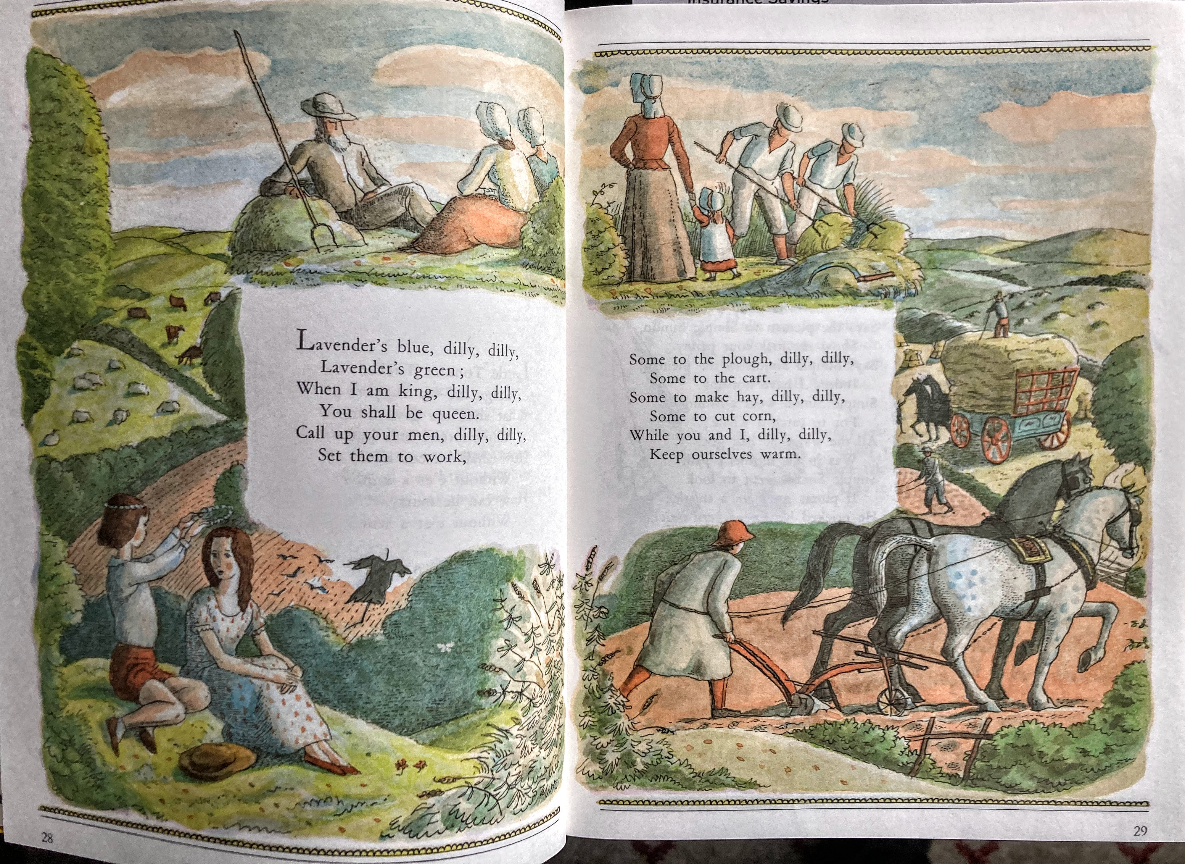 Many nursery rhyme collections have also been beautifully illustrated (e.g. Arthur Rackham, one of my favorites). When we were young, our parents gave us a wonderful collection, Lavender’s Blue: A Book of Nursery Rhymes. Kathleen Mary Lines (1902–1988), a book critic, editor and librarian from Canada (Edmonton, Alberta), put the anthology together in 1954. Since then, it’s been reprinted 15 times at least, an indication of its success.