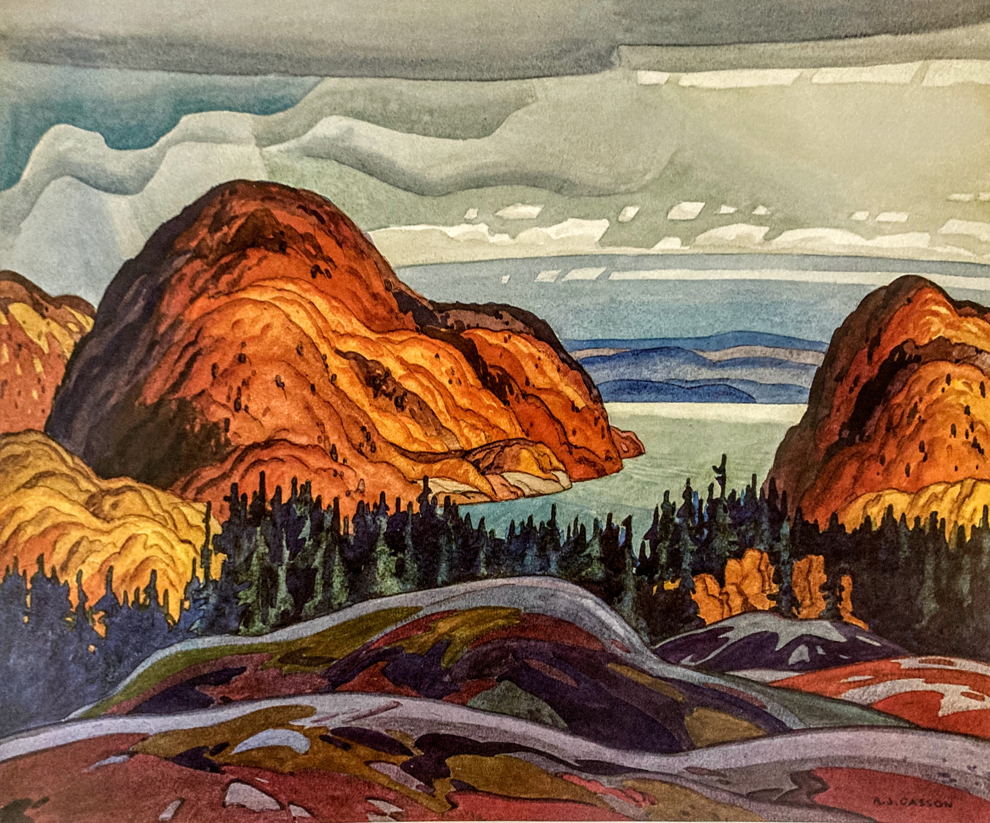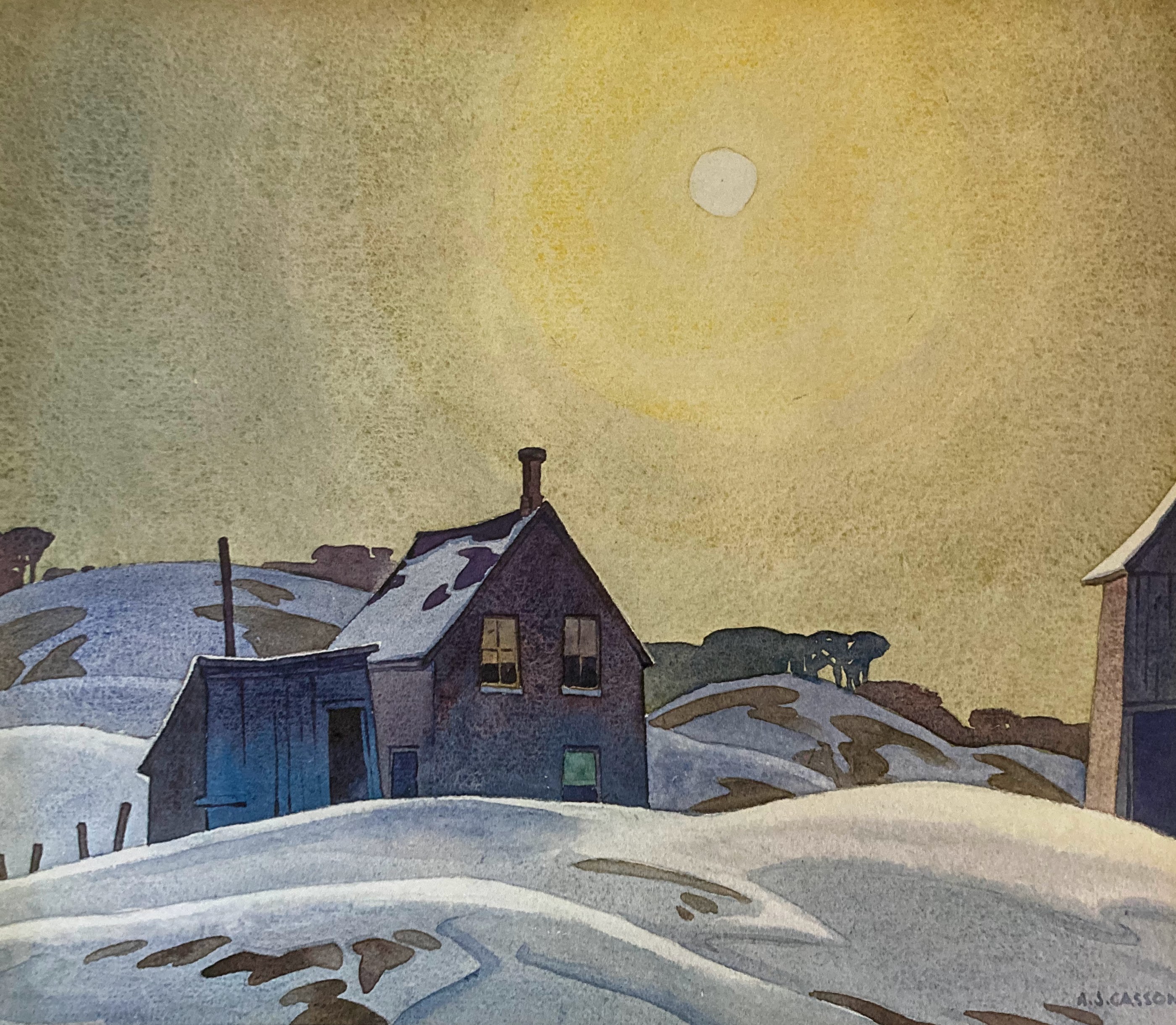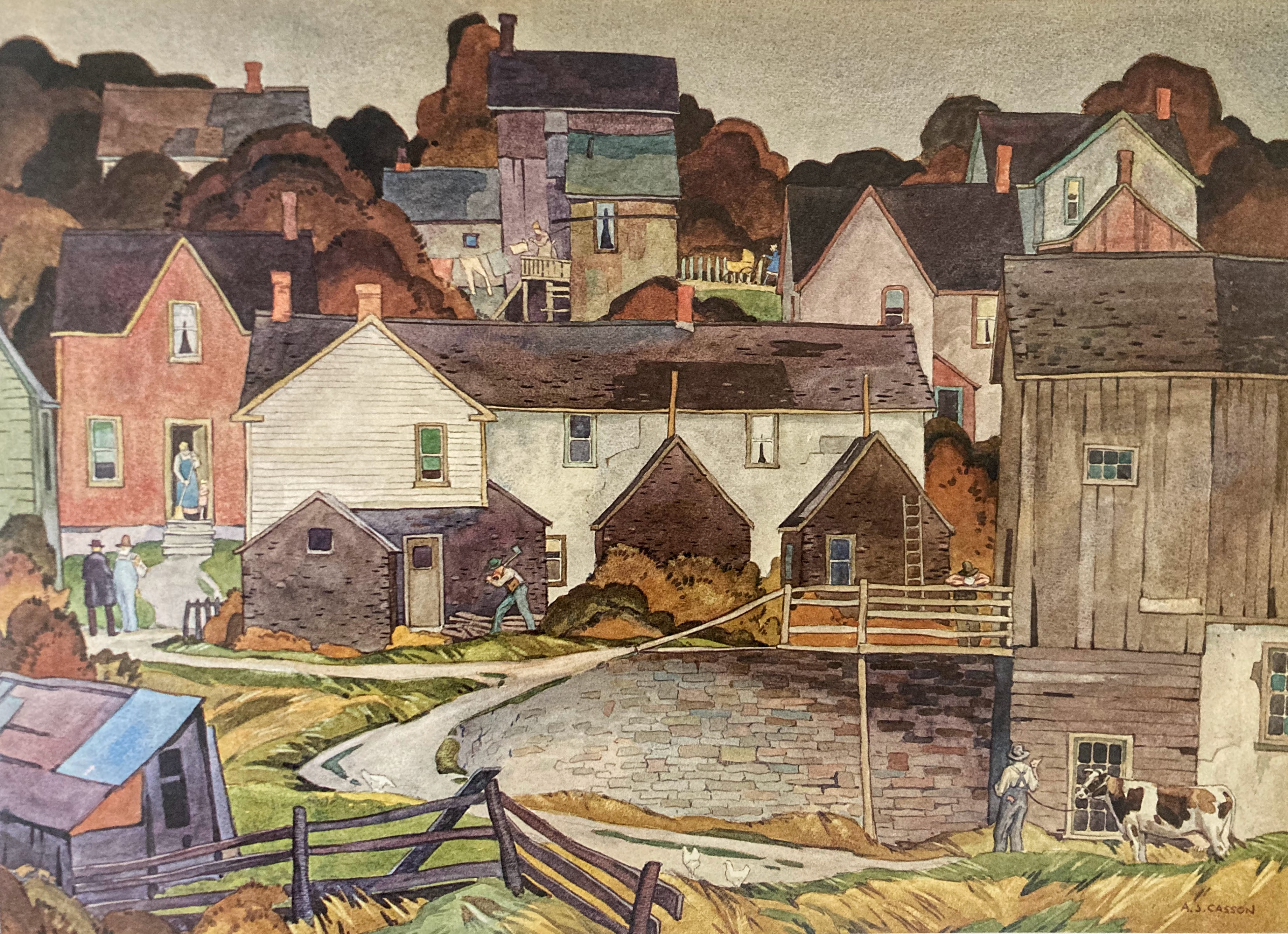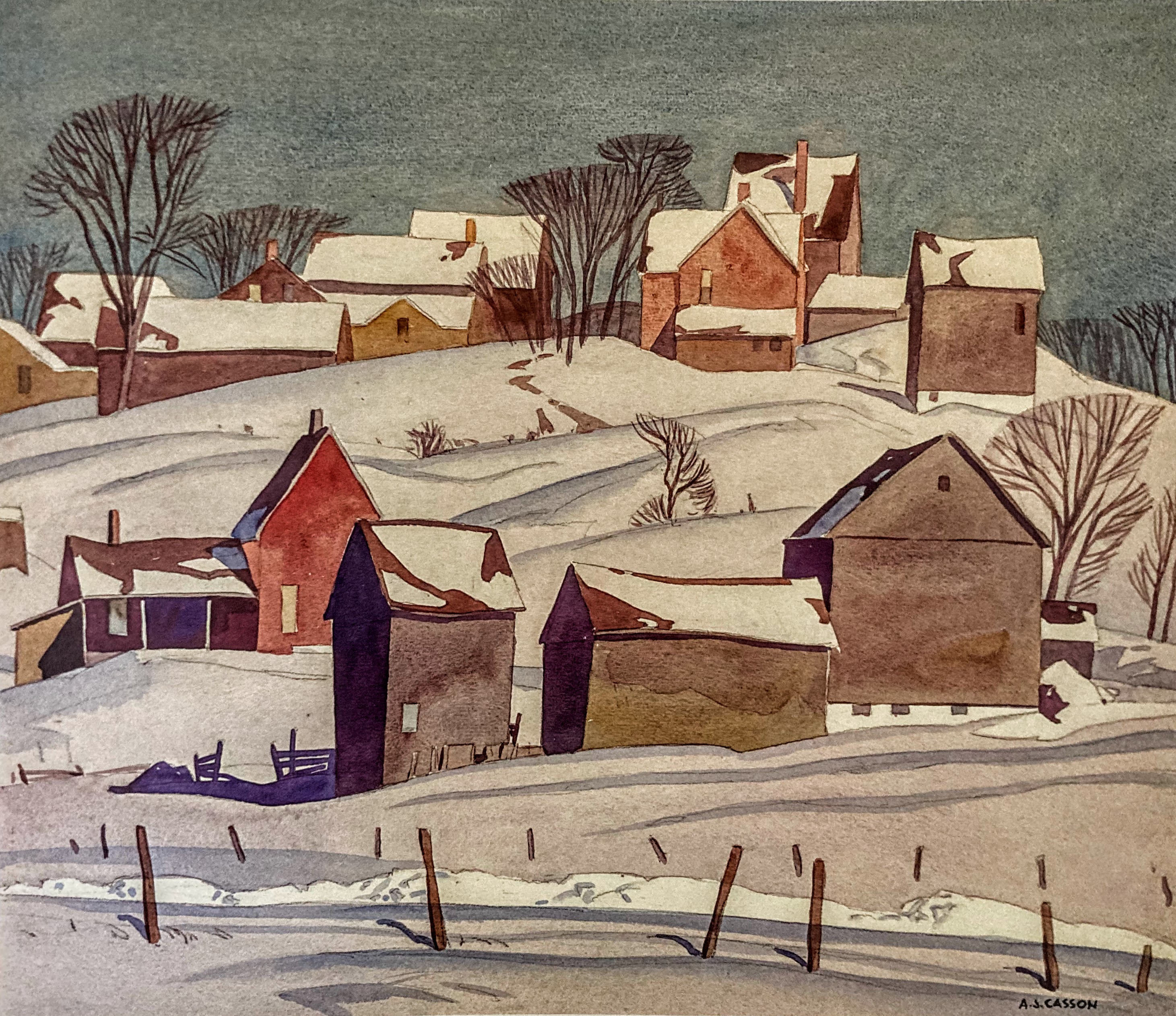 Noted Canadian art critic and writer Paul Duval (1922 – 2018) called Casson “one of the most powerful and expressive watercolour painters Canada had ever known. His compositions had acquired a sure formalization, his washes were laid with such a consummate assurance and the boldness of his colour revealed a brilliance and depth then rarely seen in the medium, he managed to convey the maximum of depth in his shadows without destroying the transparency of gis paint or the integrity of the luminous white paper beneath it.” (A.J. Casson, My Favourite Watercolours, 1919 to 1957, p. 7)