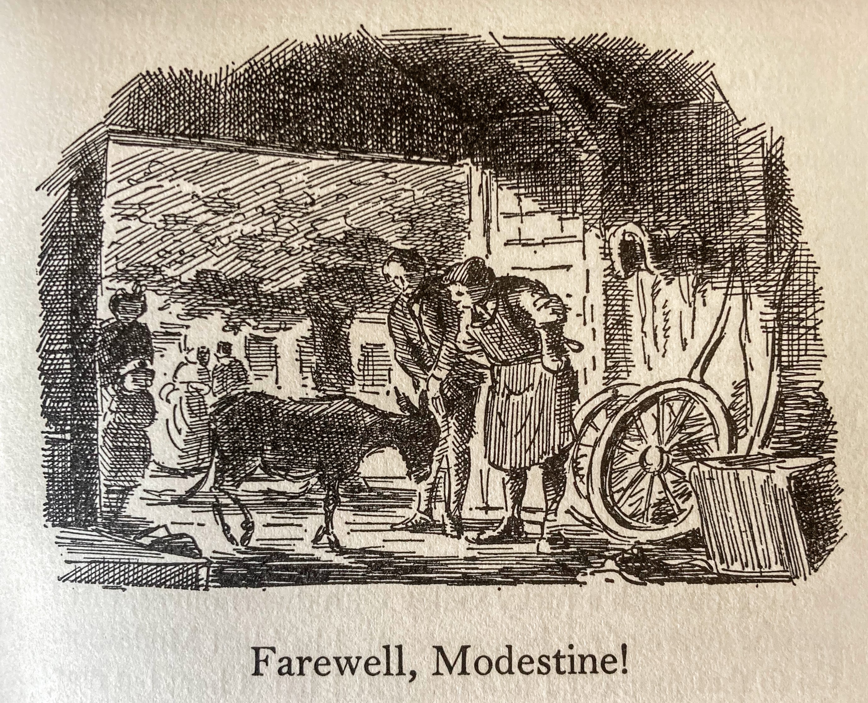 Because of an unwieldy sleeping sack (six-feet square!), Stevenson must purchase a beast of burden for his travels. “What I required was something cheap and small and sturdy, and of a stolid and peaceful temper; and all these requirements pointed to a donkey.” (p. 13) Stevenson finds a she-ass, “not much bigger than a dog, the colour of a mouse with a kindly eye and a determined under-jaw”, and upon first examination of good temper. (p. 13) He purchases the donkey and names her Modestine.