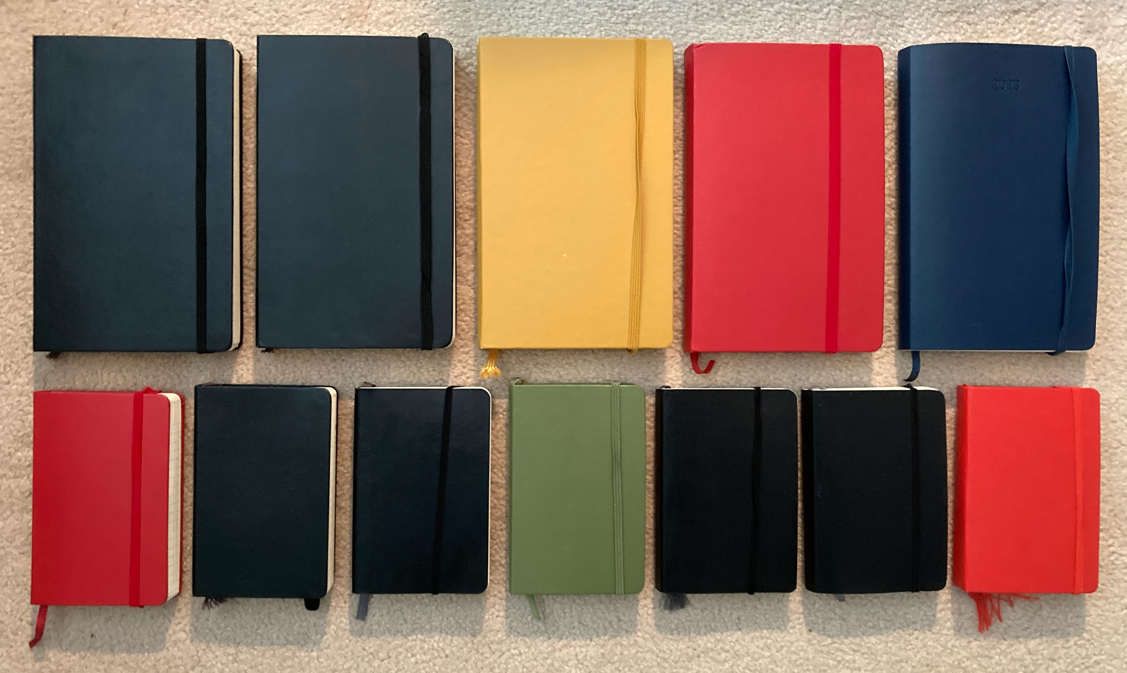 I’m now on my 12th Moleskine diary, all one page per day, but as you can see, of differing sizes, colors and covers, some hard, some soft, usually depending upon what’s available at year’s end when I go searching the local shops. Recently, I seem to require the larger version, usually purchased from the Vancouver Art Gallery gift shop.