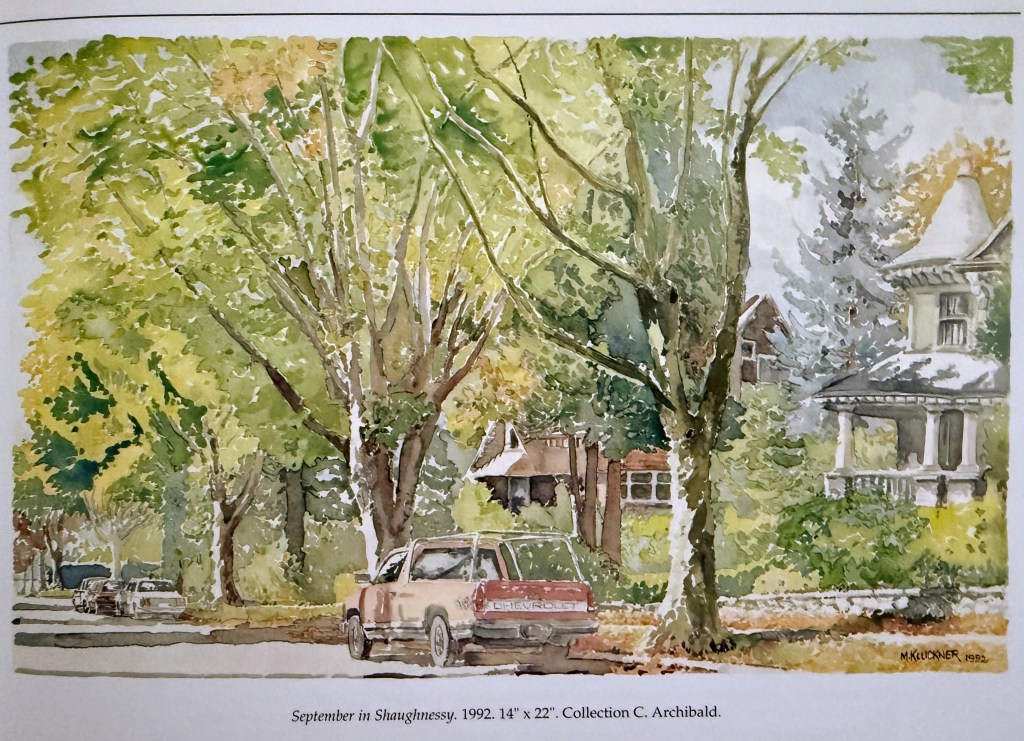 The accomplished B.C. watercolourist, Michael Kluckner, published Victoria The way It Was in 1986 and Vanishing Vancouver in 1990, recording much of what existed in these two cities, but has disappeared or remains at risk. The above evocative illustration is an excerpt from his follow-up 1993 book, British Columbia in Watercolour, which records the “mansions, cabins, churches, front porches and gardens, roadside shacks and grand panoramas that are the essence of the province.” (p. 9)
