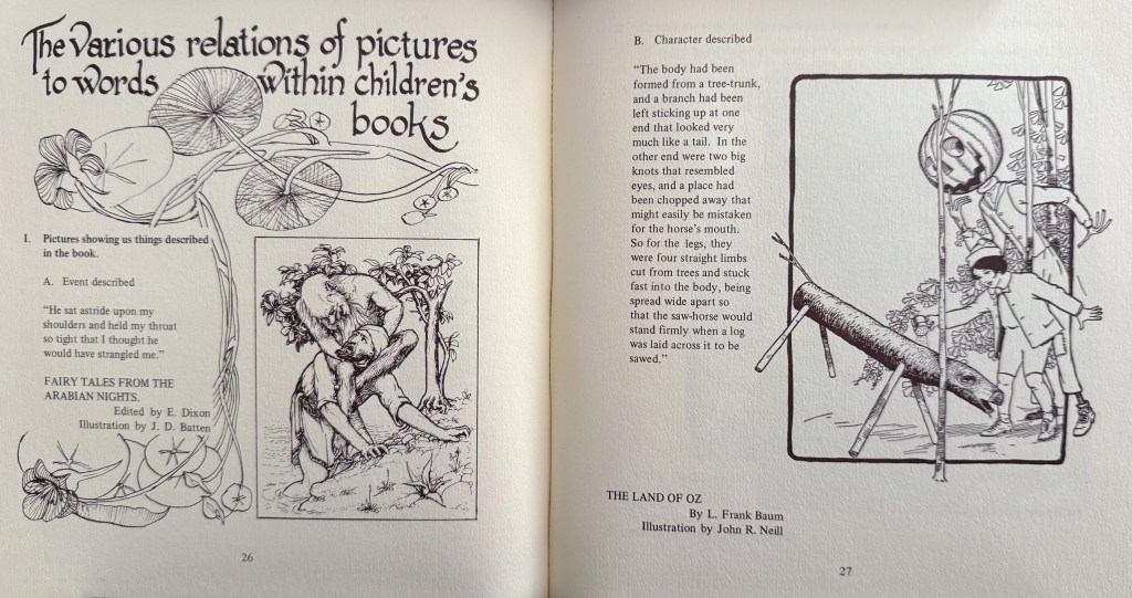 Rather than chapters, the book contains sections with titles like: The various relations of pictures to words within children’s books; Pictures of Domestic Happiness; Picturing the Realm of Faërie; Looking at Pictures of Animals; and Answer to the argument that illustrations block the imagination, that without them the mind would do what the illustrator does, ONLY for the reader, more satisfyingly.