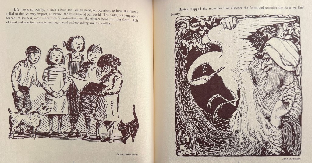 I purchased the book because a) it dealt with two of my favourite subjects, children’s literature and illustration, and b) it was of rare quality for a small paperback: hand-pasted pictures, no less.