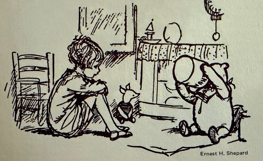 Piglet stares into the fire in an intense but relaxed manner of fire starers, Pooh has his back to the fire and a jug of honey raised to his mouth, but the center of importance in the picture is Christopher Robin’s face as he looks at Pooh. His is a look of concern, almost a paternal look. He is that most remarkable, affecting thing, a child with the feelings of an adult.”