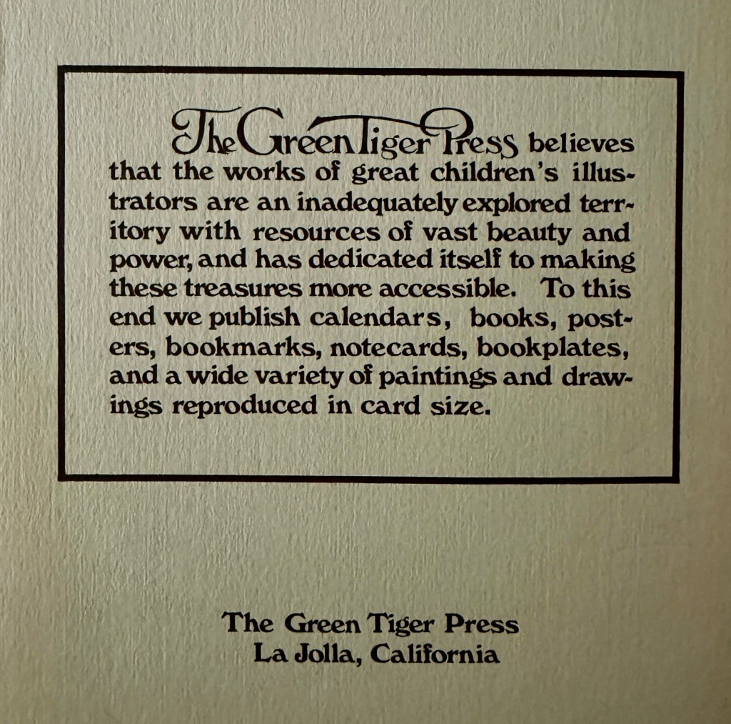 Green Tiger Press started in the 1960’s as a postcard business specializing in reproductions of out-of-print illustrations by artists and illustrators. It was owned and run by Harold and Sandra Darling. It seems, by most accounts, that the pair were, if not reclusive, very private people, preferring to keep behind the scenes, even avoiding being photographed and connecting with customers.